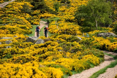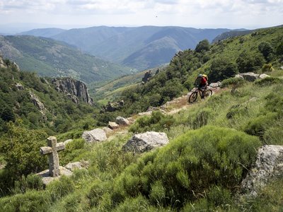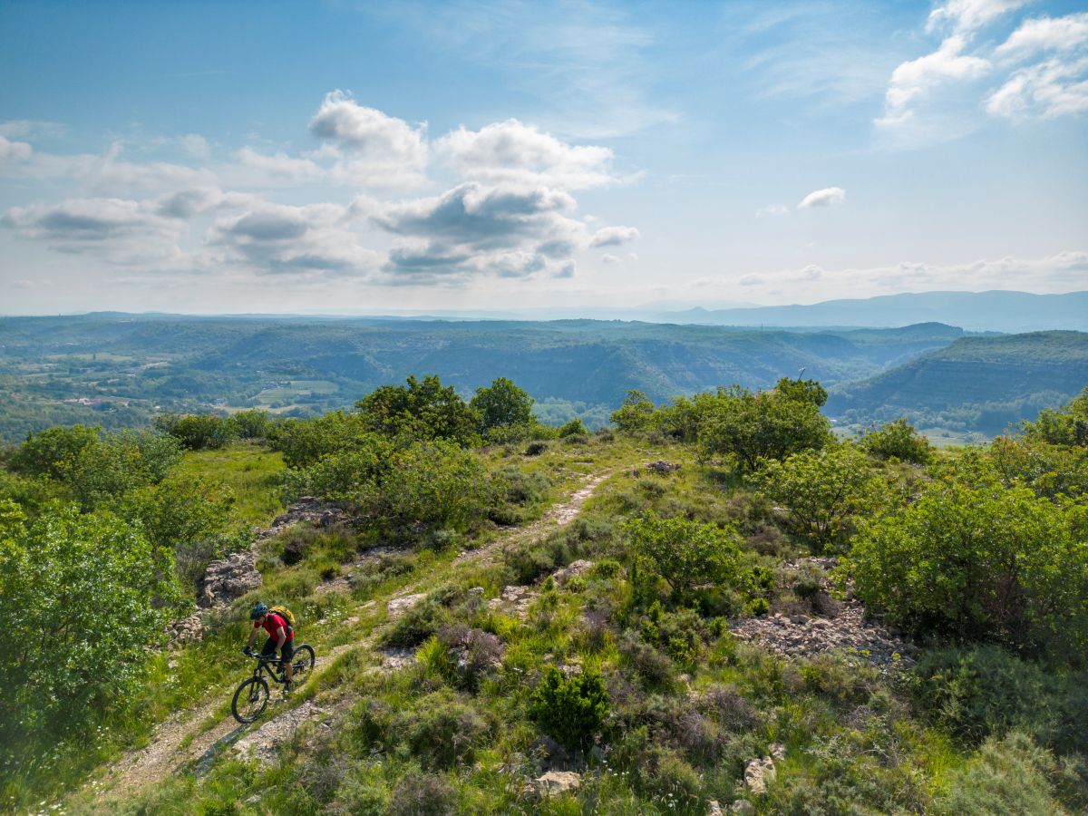 Dès le départ, le rythme s’emballe : la roue file sur des monotraces joueurs, entre châtaigniers, bois et garrigue, avant de s’élancer sur de larges pistes aux panoramas grandioses. Les sentiers se succèdent, tantôt rapides, tantôt techniques, jusqu’à la Drobie. Puis vient la montée, caillouteuse et forestière, vers les hauteurs, où la vallée de la Baume invite à peaufiner son pilotage. Le massif du Tanargue se dresse alors, exigeant endurance et souffle, mais offrant, en échange, une mosaïque de paysages et la rencontre des vautours dans le ciel. Et pour finir, un profil descendant, joueur et varié, alterne roulants, passages musclés et vues à couper le souffle, avant de plonger vers les eaux fraîches du Chassezac. Une dernière bouffée d’adrénaline… puis Les Vans, et la certitude d’avoir vécu une grande aventure.